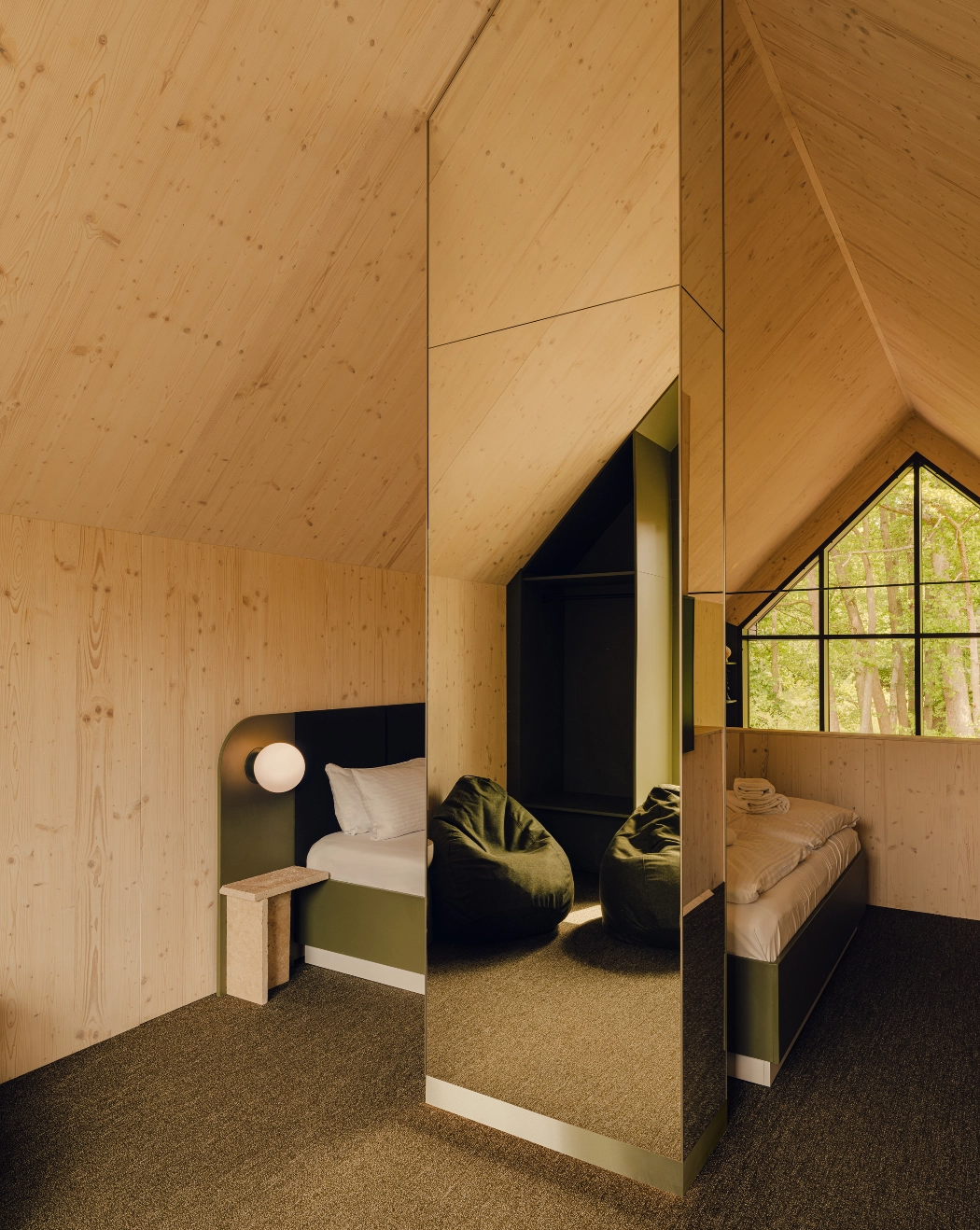 Jedes Chalet verfügt über zwei separate Schlafzimmer – eines im Erdgeschoss und eines auf der Empore – sodass pro Chalet zwei Personen in getrennten Schlafräumen übernachten können. Insgesamt stehen sechs Chalets zur Verfügung, die Platz für bis zu 12 Personen mit Einzelbelegung oder 24 Personen bei voller Auslastung bieten.